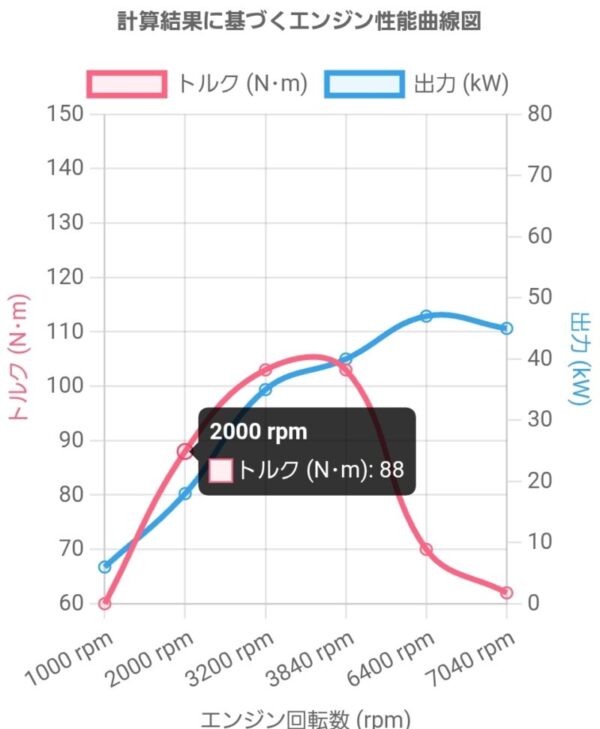 ここでは最大トルク、最高出力、回転数を入力すると各々の回転数におけるトルクと出力を予測して計算されます。